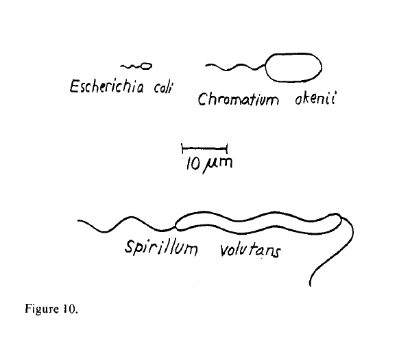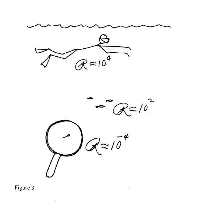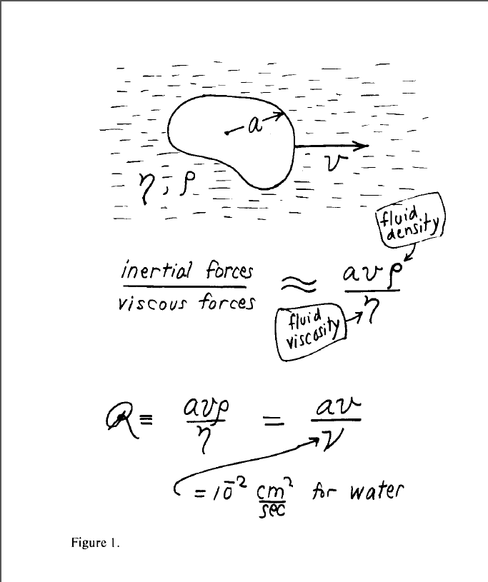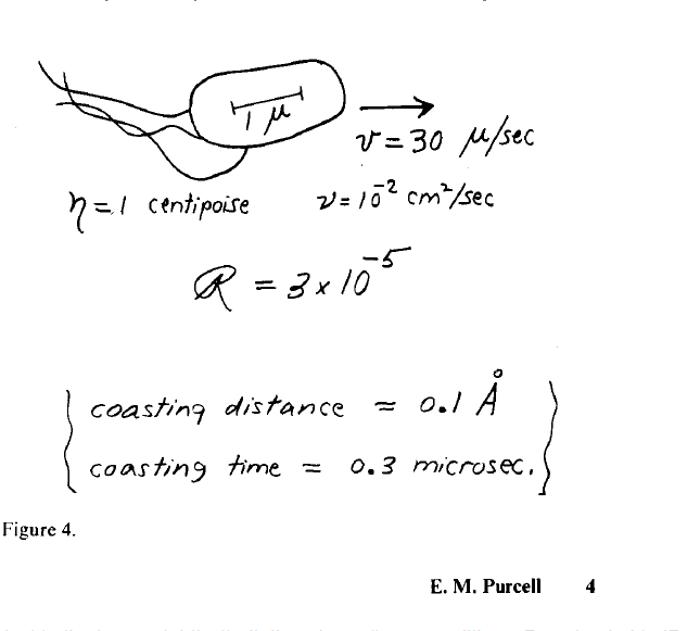 Yukarıda resmettiği (Figure 4.) şekliyle Purcell, 1 µ mertebesinde boyuta sahip olan bir hayvanı (hareket akışkanlığının saniyede 10^-2 cm2 olduğu bir suda ve bu boyuttaki bir canlının tipik olarak 30 µm/sn hızla hareket ettiği bilgisinden hareketle) hareket ettirmek için aniden ittirmesi gerektiğinde eylemsizliğin hiçbir rolünün olmadığı dahası bunların F = m.a yı da pek umursa-ya-madıkları, şu anda yaptığınız şeyin tamamen size o anda uygulanan kuvvetler (viscous forces/akışkanlar kuvveti)a tarafından belirlenip geçmişteki hiçbir şeyin etki etmeyeceği sonucuyla, 0.1 Å buluyor.